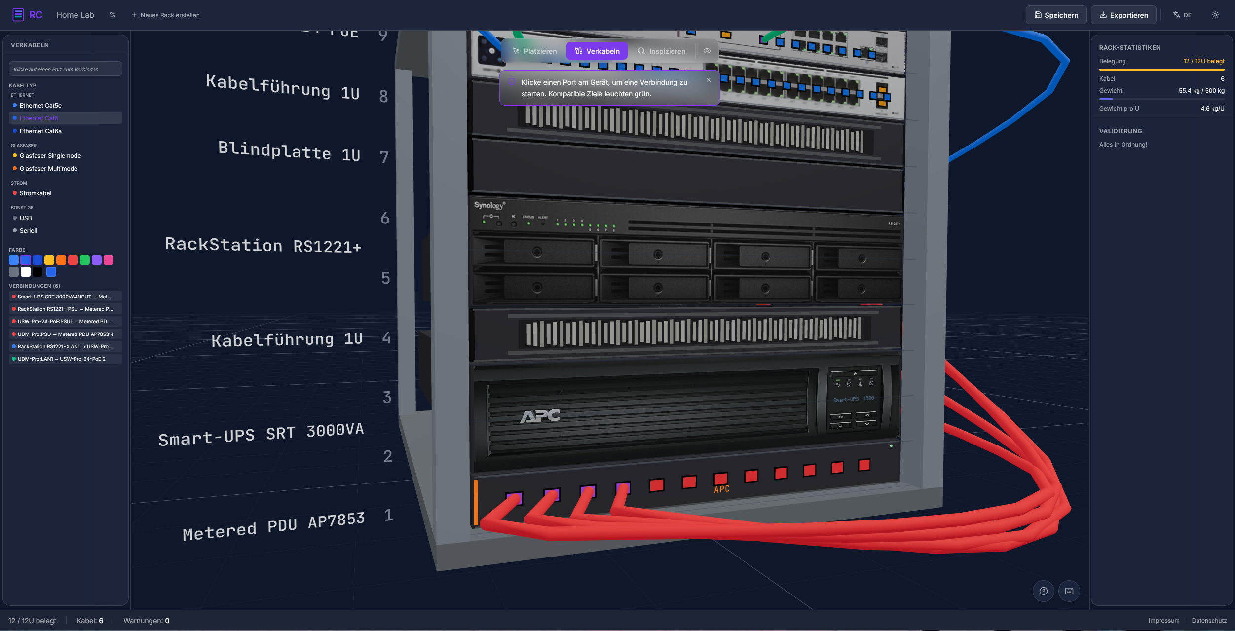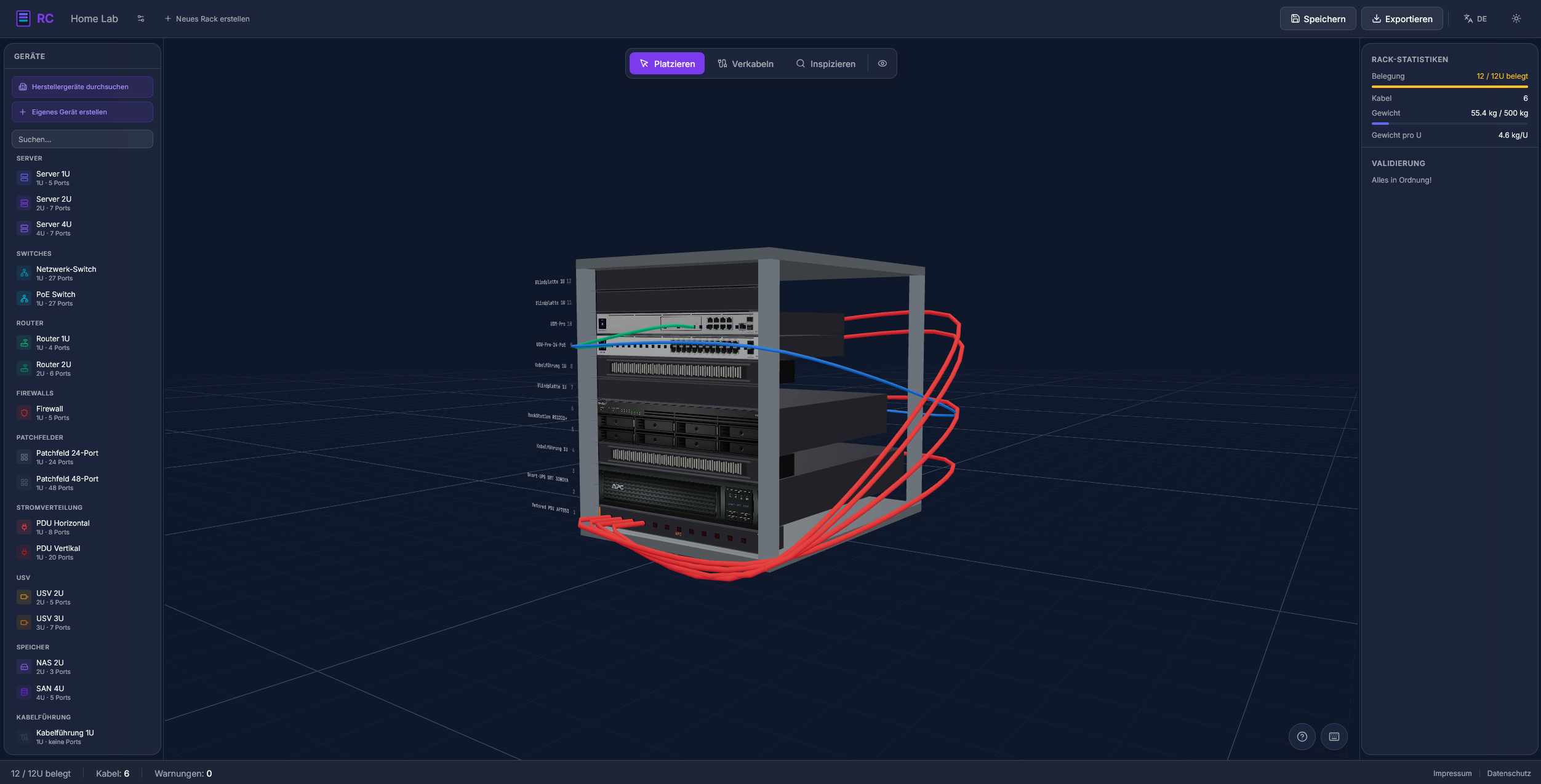 Ein 3D-Server-Rack-Planer im Browser: Geräte aus dem Katalog ziehen, Ports verkabeln, Validierungen checken. Alles läuft lokal, keine Cookies, keine Tracker. Ein Tool zum Rack-Planen und Durchspielen, inklusive PDF-Plan-Export.